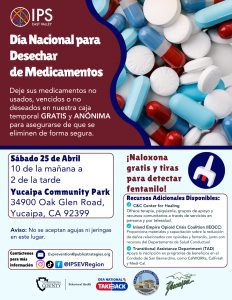Event Description: Institute for Public Strategies (IPS) East Valley in collaboration with the Yucaipa Sheriff's Department, The City of Yucaipa, Drug Enforcement Administration, and C&C Center for Healing is hosting a safe disposal site for unwanted or unused prescriptions. The site will host drop boxes where medications can be anonymously forfeited and safely disposed of by professionals. Come by to drop off unused expired or unwanted medications. Free Naloxone and Fentanyl Test Strips will also be distributed.
