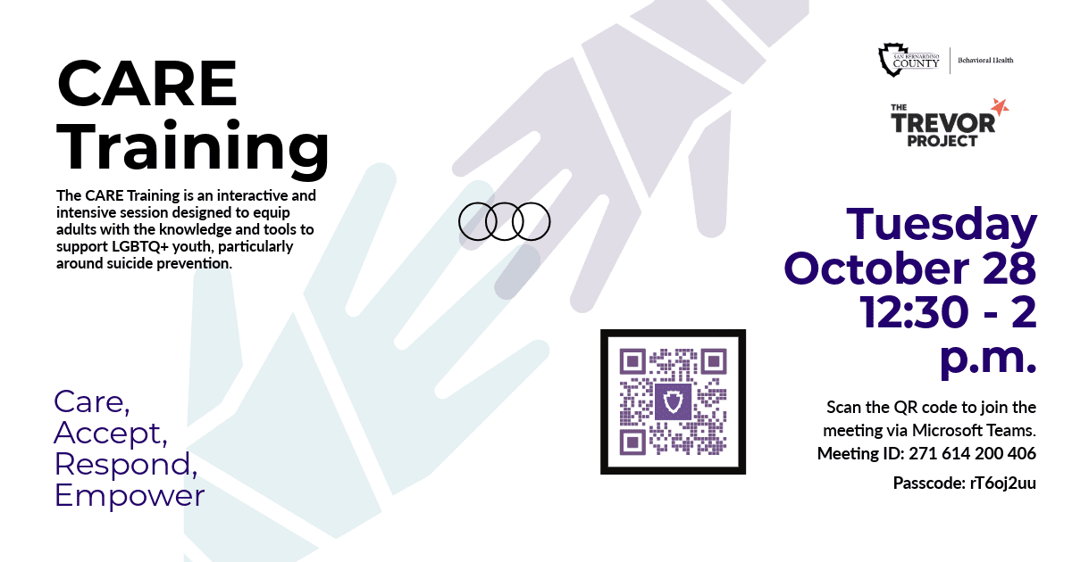 The CARE Training is an interactive and intensive session designed to equip adults with the knowledge and tools to support LGBTQ+ youth, particularly around suicide prevention. Please join us on Tuesday October 28th 12:30PM-2:00PM via Microsoft Teams click the flyer here.